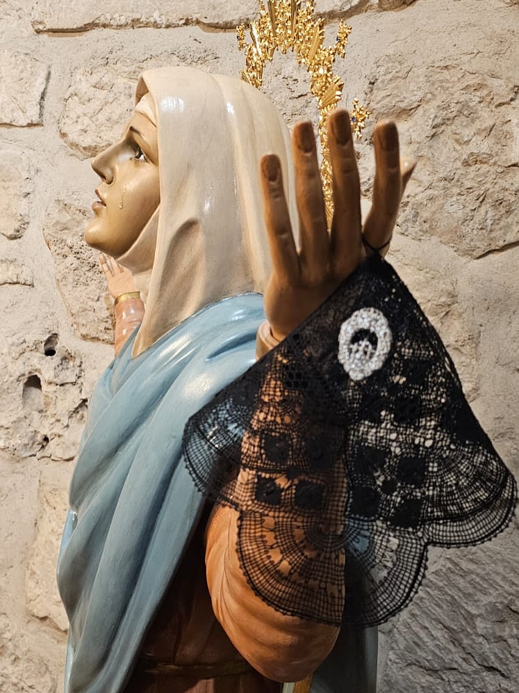 Con motivo del fallecimiento y entierro del sumo pontífice, la Virgen de Las Siete Palabras, luce pañuelo negro en señal de tristeza y respeto. “La humildad le hizo más fuerte que el lujo, y Jesús, a través de su palabra, entró de nuevo en infinidad de corazones”.